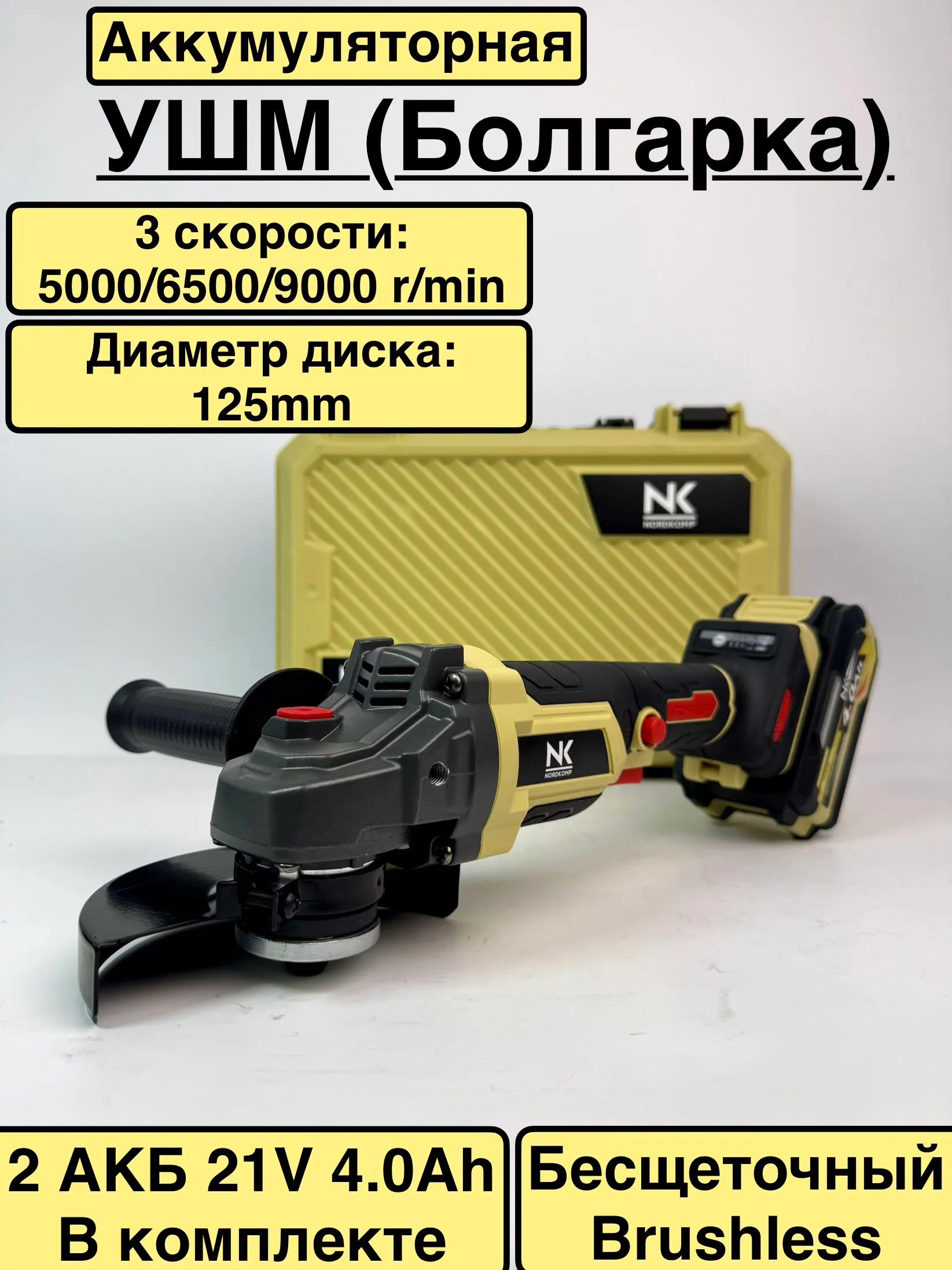 КомплектацияАккумуляторная УШМ NORDKOMP.