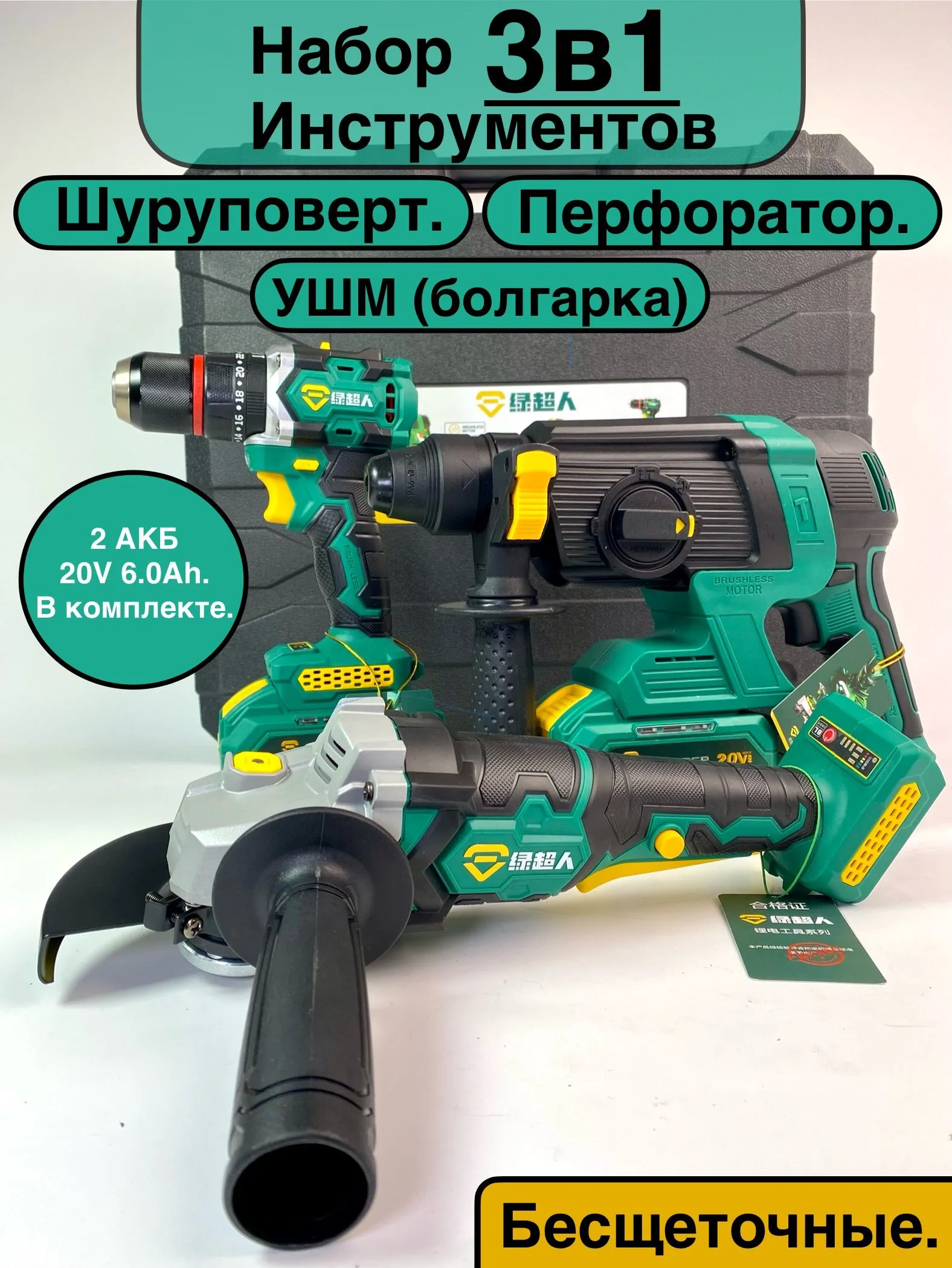 Пepфoратop . Шуруповерт. УШM. 2 АКБ 6.0А с индикацией заряда. 1 зарядная станция. Кейс.