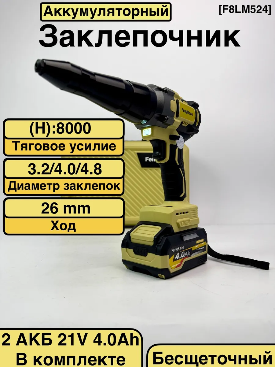 Аккумуляторный бесщеточный заклепочник F8LM524 — это мощный инструмент профессионального класса, предназначенный для быстрой и качественной установки вытяжных заклепок. Он заменяет ручной труд автоматизированным процессом, что критически важно при больших объемах монтажных работ. Основные преимущества Бесщеточный двигатель: обеспечивает высокую производительность, долговечность и экономный расход заряда батареи. Инструмент не перегревается при интенсивных нагрузках. Высокое тяговое усилие: благодаря мощному 21В мотору, заклепочник легко справляется с заклепками из различных материалов, включая сталь и нержавейку. Универсальность: прибор поддерживает работу с самыми популярными диаметрами заклепок — от 3,2 мм до 4,8 мм. Интеллектуальное управление: модель оснащена несколькими уровнями настройки силы втягивания (до 5 уровней), что позволяет точно подстроить инструмент под конкретную задачу. Технические характеристики Напряжение питания: 21 В. Поддерживаемые диаметры: 3.2 мм, 4.0 мм, 4.8 мм. Тип заклепок: вытяжные (алюминий, сталь, нержавеющая сталь). Вес: около 2,1 кг, что обеспечивает хорошую устойчивость и уверенный хват. Комплектация Заклепочник F8LM524 2 аккумулятора емкостью 4.0 А·ч (совместимы с другой техникой FengBao и аналогами). Зарядное устройство. Комплект сменных насадок и ключ. Прочный пластиковый кейс