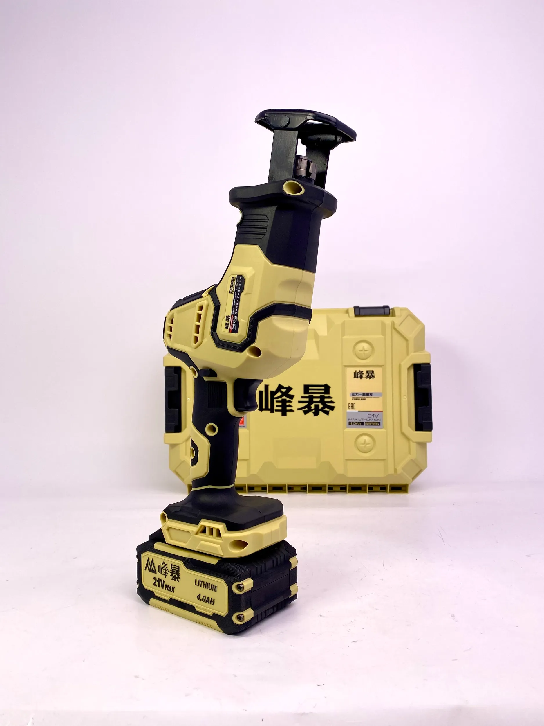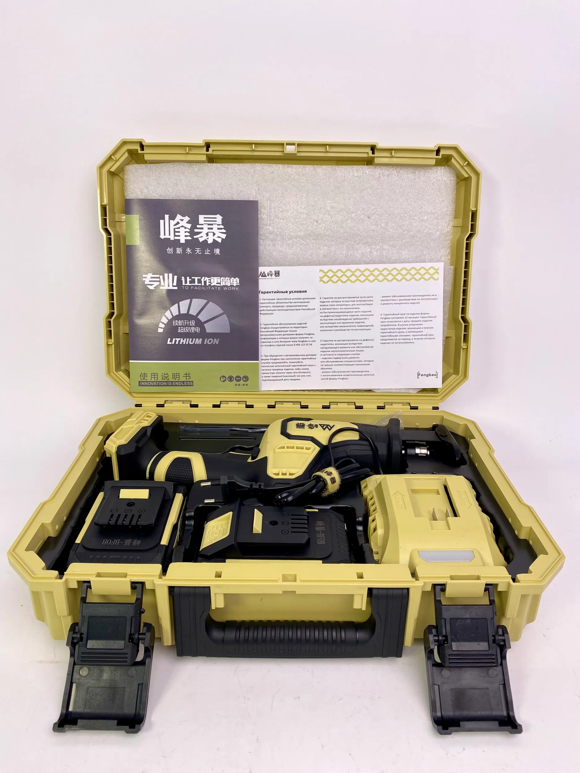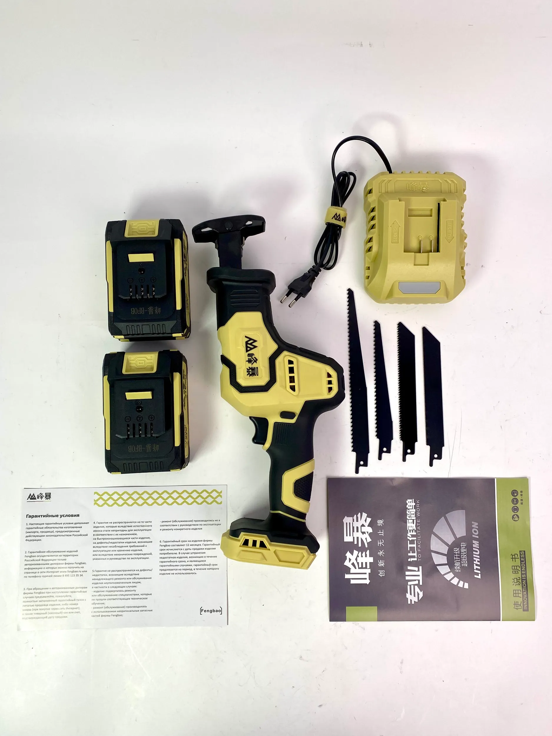 Сабельная пила FengBao DB-02-08. 2 литий-ионных аккумулятора высокой емкости 4.0 А·ч Зарядное устройство. Набор пильных полотен (пилок). Пластиковый кейс для удобного хранения и транспортировки