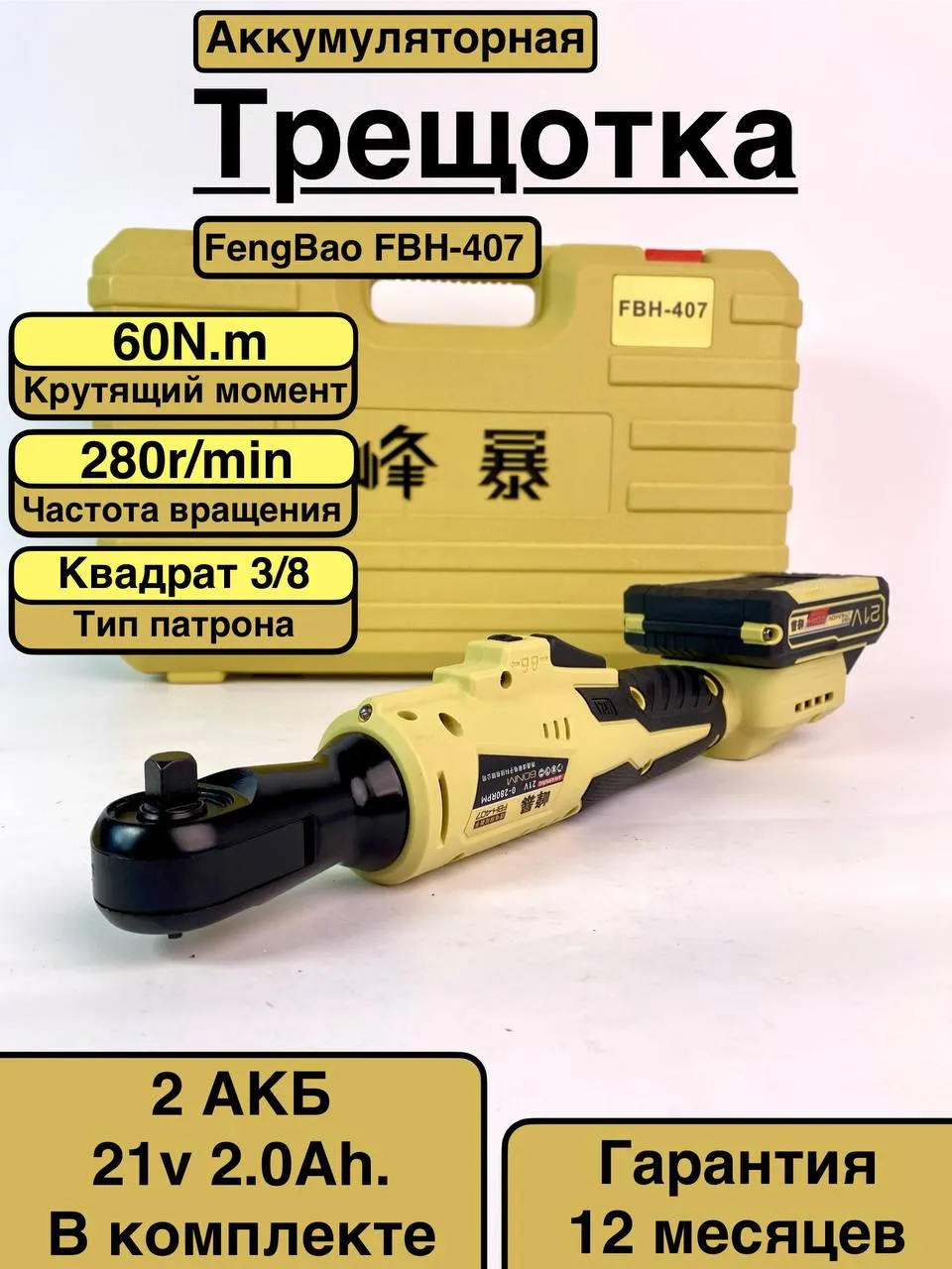 FENGBAO Трещоточный ключ аккумуляторный FB-407 - мощный помощник для сложных задач! Профессиональный гайковерт обеспечивает максимальный крутящий момент до 60 Нм, легко справляется даже со сложными закручиваниями. Бесщеточный двигатель гарантирует высокую надёжность и длительный срок службы. Инструмент оснащен плавным запуском и возможностью регулировки скорости для контроля усилий. В комплекте две ёмкие литий-ионные батареи, зарядное устройство и защитный кейс - всё необходимое для мобильной работы. Антивибрационная рукоятка с мягкой накладкой снижает нагрузку на руки во время эксплуатации. Идеален для мастеров, требующих от оборудования сочетания силы, точности и комфорта.