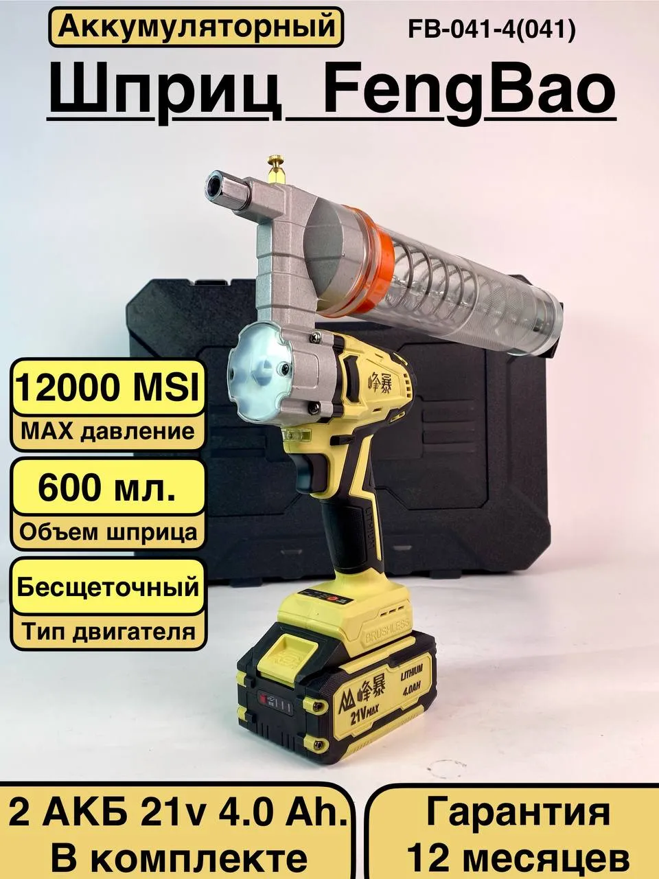 С двумя аккумуляторами емкостью 21B 4.0Ач вы сможете использовать его на протяжении длительного времени без необходимости частой подзарядки. Автономность и высокая производительность делают этот шприц идеальным решением для выполнения различных задач по смазке. Конструкция шприца продумана для удобства в использовании. Он оснащен эргономичной рукояткой, что обеспечивает комфорт при работе и минимизирует усталость даже при длительном использовании. Благодаря продуманному дизайну, вы сможете легко контролировать процесс и точно дозировать смазку, что особенно важно для обработки труднодоступных мест. Этот аккумуляторный шприц подходит для работы с различными видами смазок, что делает его универсальным инструментом для автотоваров. Шприц легко справляется с задачами по смазке, позволяя вам поддерживать ваше транспортное средство в идеальном состоянии и продлевая его срок службы. Не упустите возможность улучшить свои навыки работы с инструментами и сделать процесс обслуживания автомобилей более эффективным. Шприц для смазки от FengBao - это отличный выбор для профессионалов и автолюбителей, которые ценят качество и надежность.