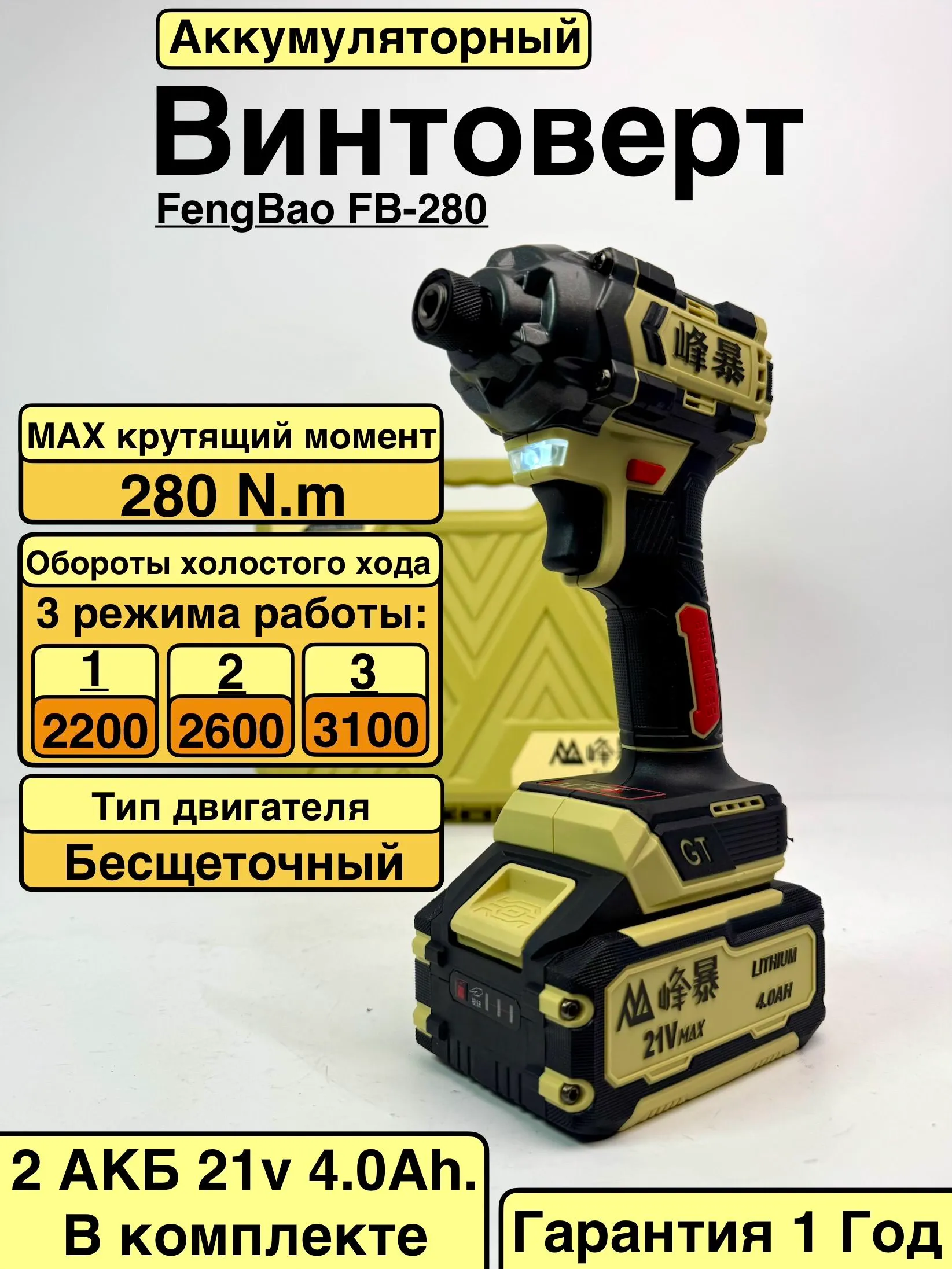Винтоверт FengBao FB-280. 2 литий-ионных аккумулятора (4.0 Ач). Зарядное устройство. Прочный транспортировочный кейс.