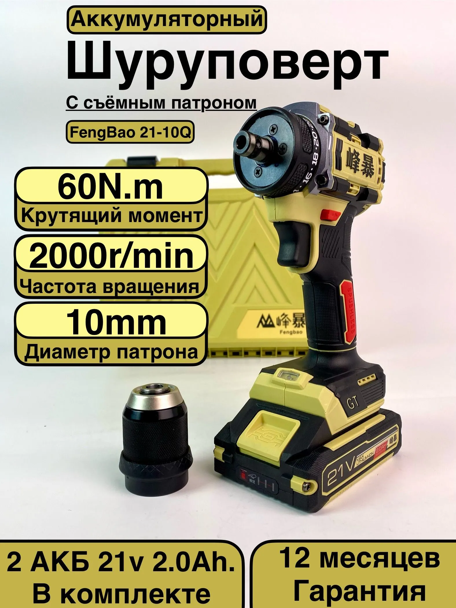 Итог: дрель‑шуруповёрт Fengbao FB‑21‑10Q— это мощный и функциональный инструмент для профессионалов и домашних мастеров. Сочетание бесщёточного двигателя, двух аккумуляторов, эргономичного дизайна и широкого набора функций делает его удобным решением для разнообразных задач по ремонту и строительству.