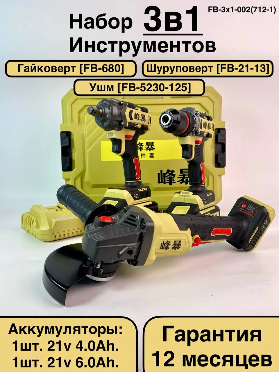 шуруповерт FB-21-13 Гайковерт Ударный FB-680 Болгарка FB-5230-125 2 акб 21В 1шт 4.0Ач. 1шт 6.0Ач зарядная станция кейс