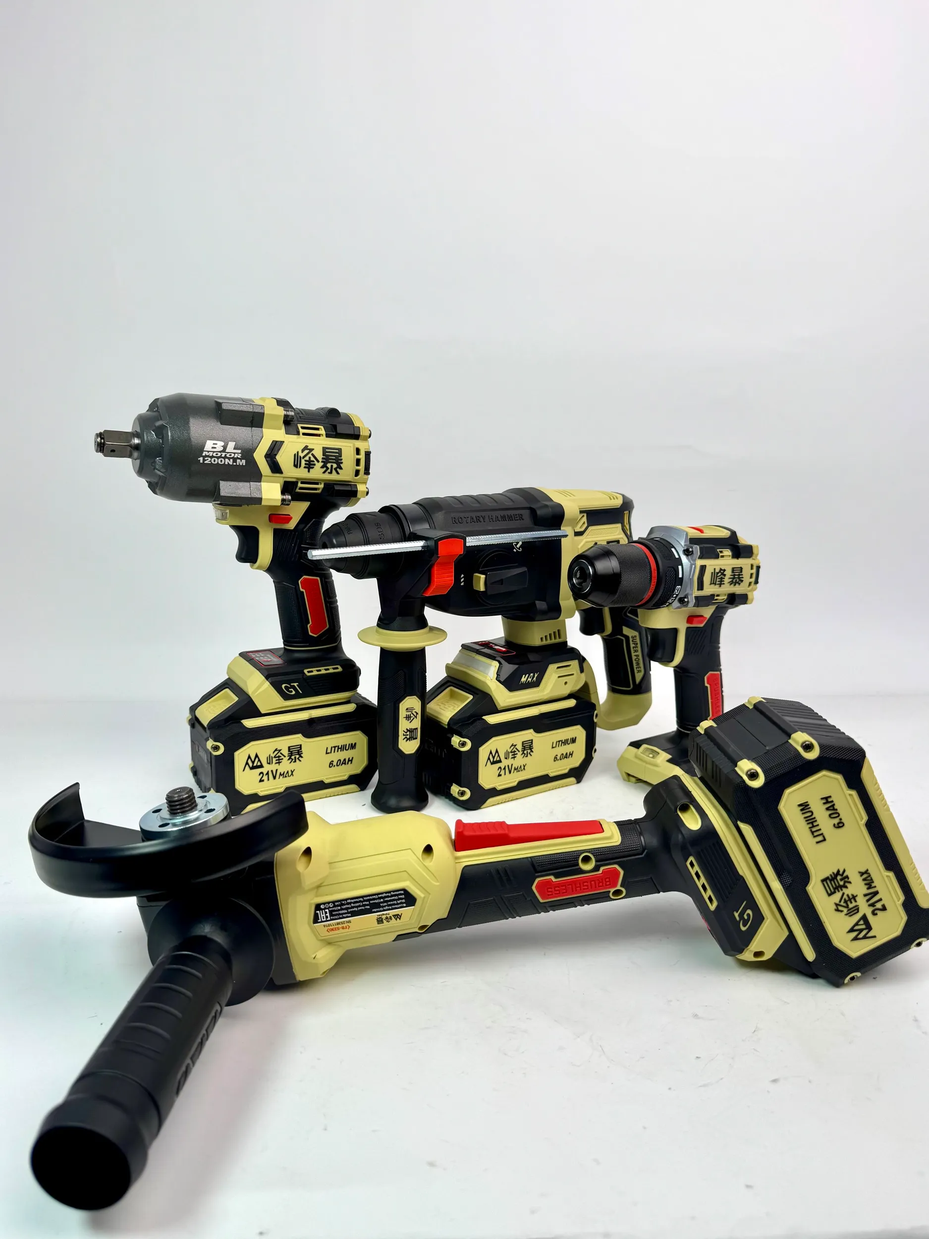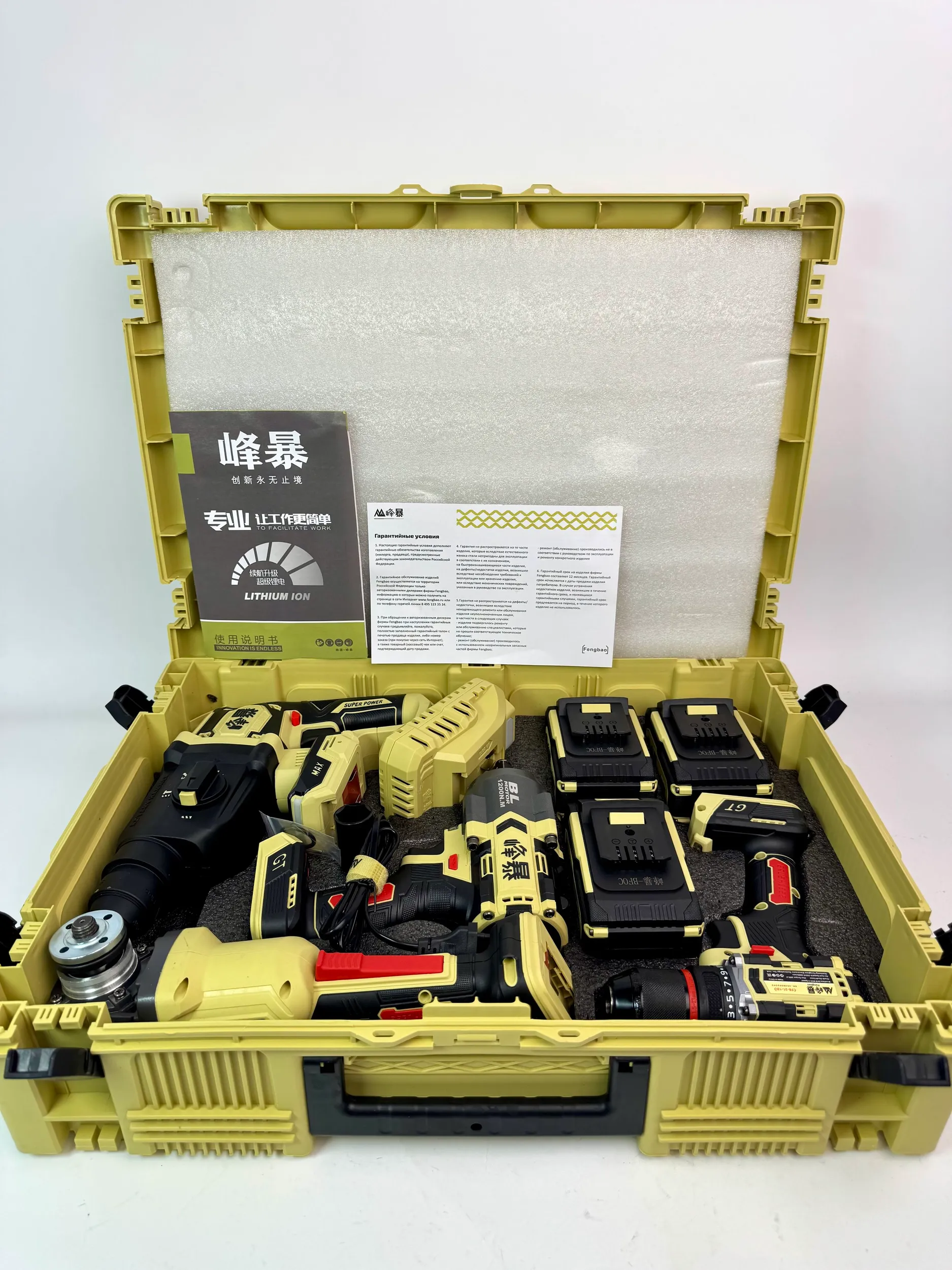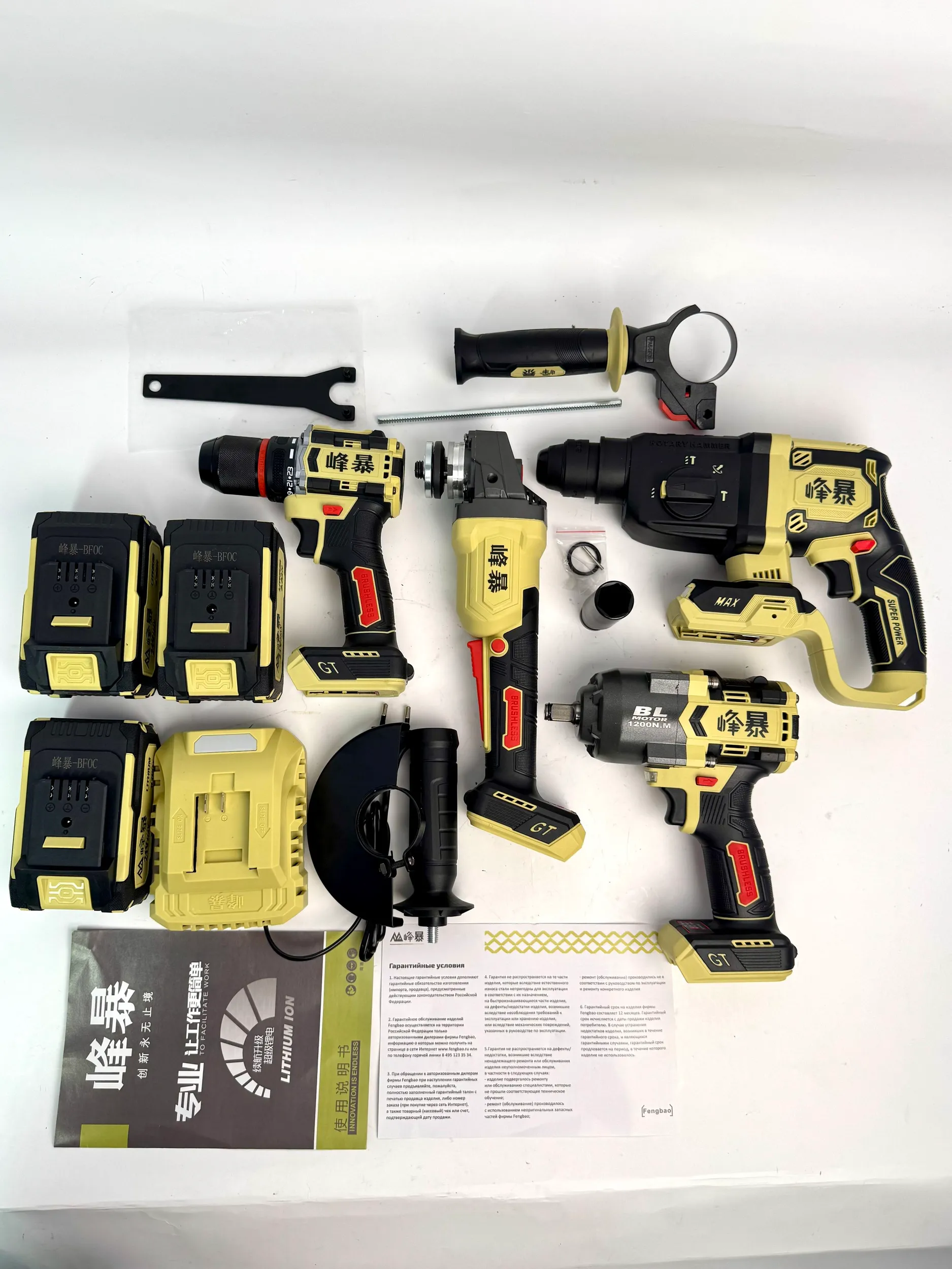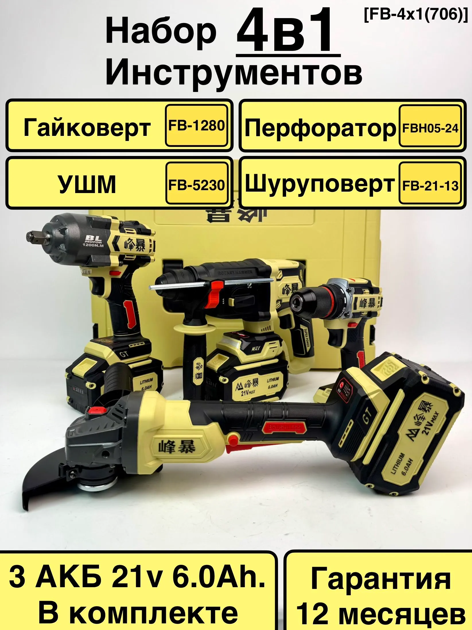 Набор аккумуляторных инструментов FengBao FB-4x1 (706) 21V: Гайковерт, УШМ, Перфоратор, Дрель-шуруповерт (3 АКБ 6.0Ah)