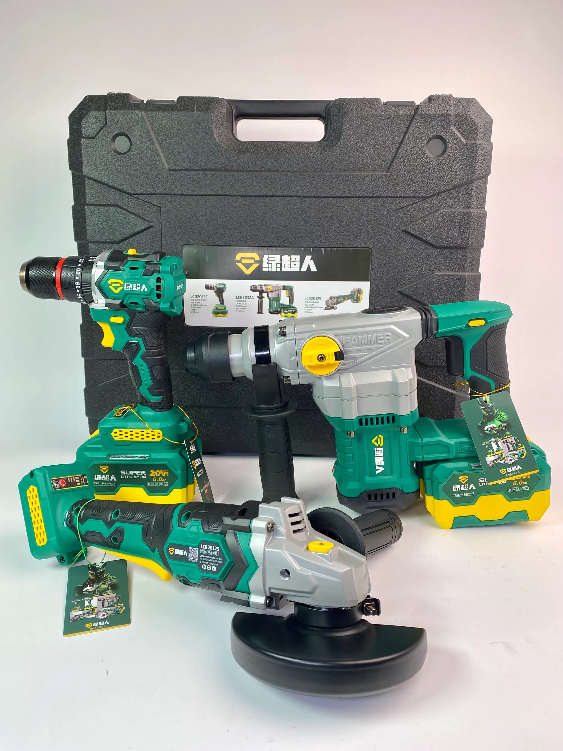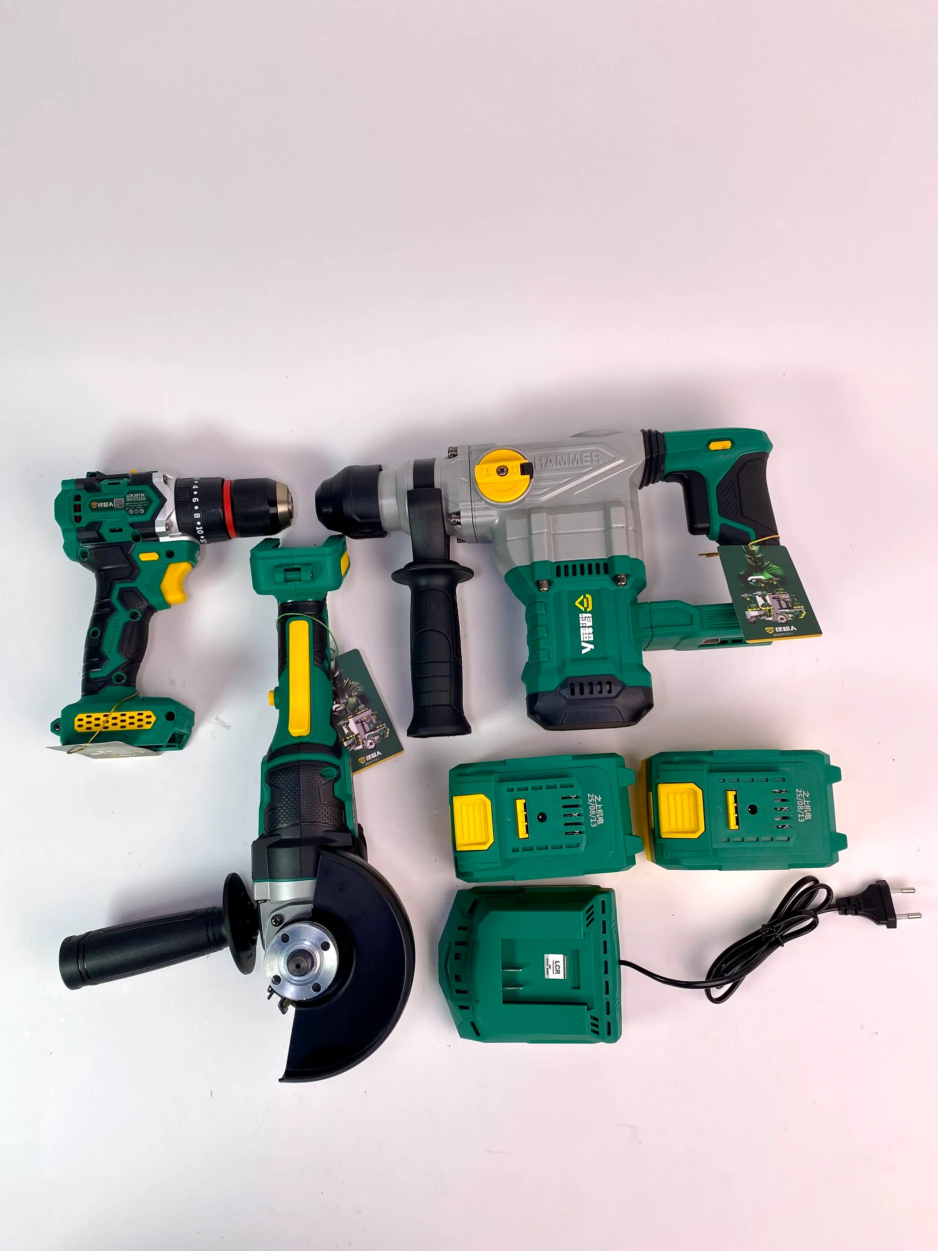 - Перфоратор. - Гайковерт. - Болгарка (УШМ) - Аккумуляторы Li-iоn 21v 6.0 Аh с индикацией заряда - Зарядное устройство-слайдер - Зашитный кожух для УШМ - Ручка для УШМ - Ключ - затяжка для УШМ - Ремешок для гайковерта - Головка для гайковерта - Фирменный противоударный кейс.